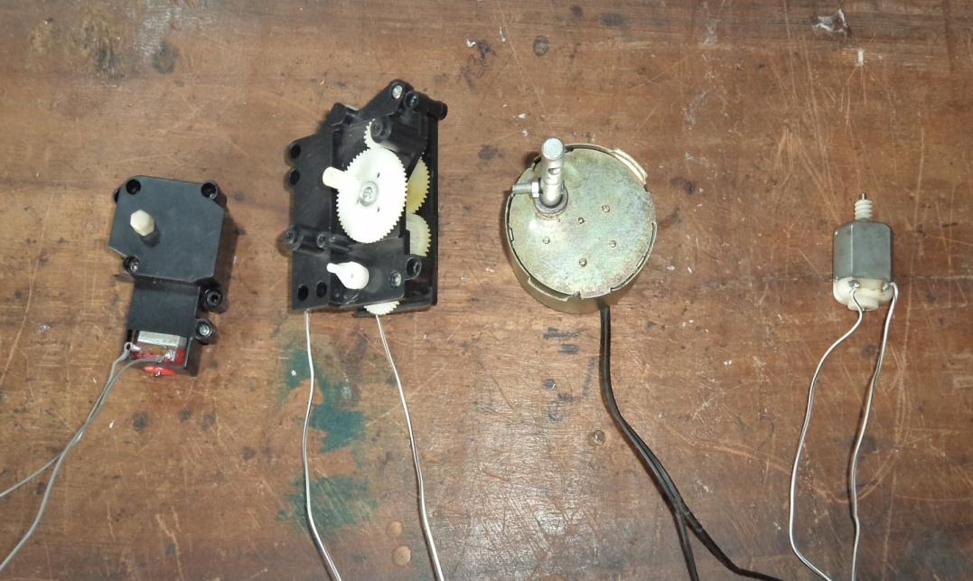 In order to reduce cost, it was necessary to look for local approximate equivalents for electric motors that would otherwise have needed to be imported. DC motors from old television antennas and from children toys were stripped, tested and suitable ones were used.  Apart from the gripper joint for which a DC motor from a toy was used, for every other joint DC motors from old television antennas were used. Plate 1.3 shows an array of some of the motors considered for the robotic arm. The second motor is the motor selected for the gripper while the third motor is an example of the television antenna motors chosen for all the other joints.