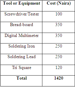 Tools and equipment needed to construct the robot are shown in table 1.2. Costs are displayed in Naira. As shown, converting the total to Dollars using a conversion rate of 1 Dollar = 158 Naira we have a total cost of 9 Dollars. Datasheets are also needed for both the IPQ77 controllers and the TIP41 and TIP42 transistors.